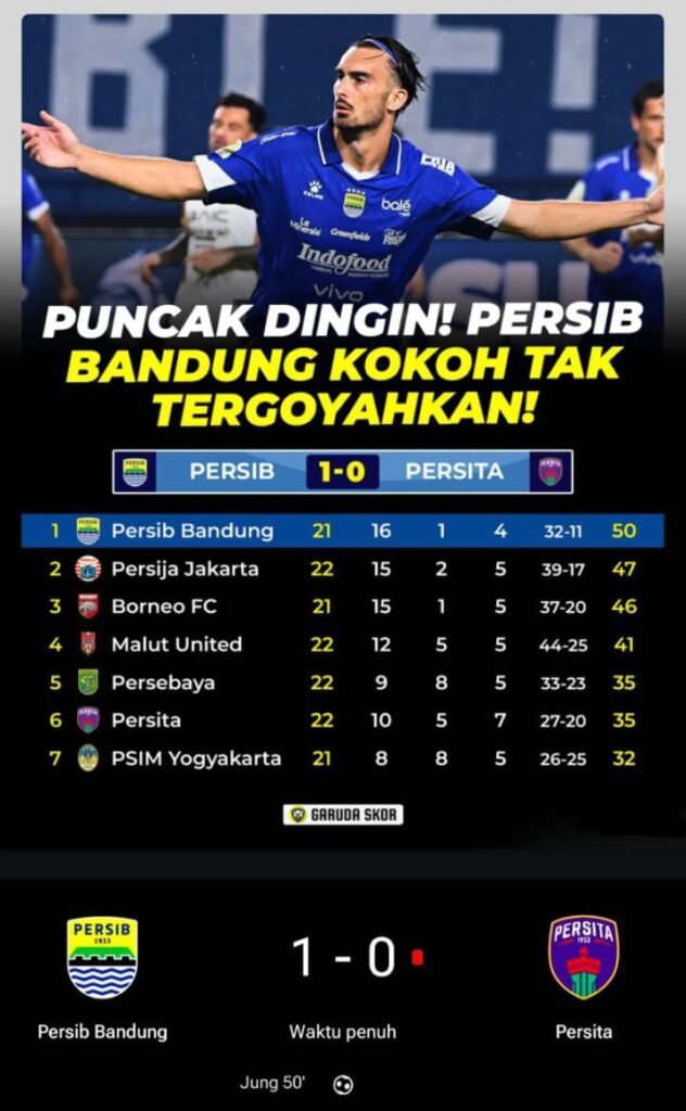 Hasil tersebut membuat Persib semakin kukuh di puncak klasemen dengan raihan 50 poin, memperlebar jarak dari para pesaingnya dalam perburuan gelar musim ini. ***