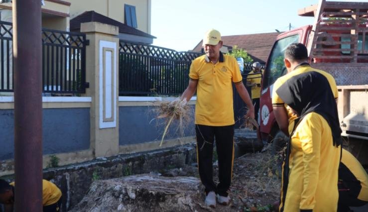 Personel tampak kompak membersihkan halaman, merapikan taman, serta mengumpulkan sampah di area sekitar mako guna menciptakan lingkungan yang bersih dan nyaman.