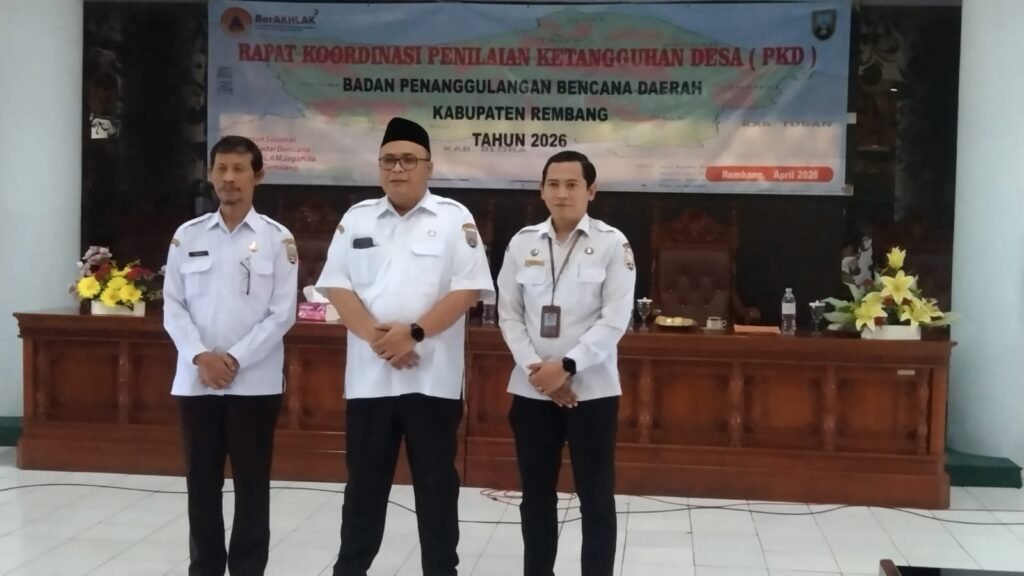 Rembang || Global Investigasi News.Com. Pelaksanaan Rakor Penilaian Ketangguhan Desa dalam menghadapi bencana di Kabupaten Rembang bertempat di Lantai IV Kantor Bupati Rembang, Rabu 15/04/2026 yang dihadiri oleh Plh Bupati Rembang Hanies Cholil BARRO’ , Kepala BPBD Kabupaten Rembang, Asisten I Sekda Kabupaten Rembang, 13O Kepala Desa, 14 Kasi Trantib Kecamatan Se Kabupaten Rembang, Ormas dan Media.